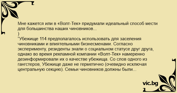 Мне кажется или в «Волт-Тек» придумали идеальный способ мести для большинства наших чиновников... ) “Убежище 114 предполагалось использовать для заселения чиновниками и влиятельными бизнесменами. Согласно эксперименту, резиденты знали о социальном статусе друг друга, однако во время рекламной компании «Волт-Тек» намеренно дезинформировали их о качестве убежища. Со слов одного из гангстеров, Убежище даже не герметично (очевидно исключая центральную секцию). Семьи чиновников должны были проживать в условиях нехватки ресурсов и отсутствия какой-либо роскоши, а Смотрителем был назначен человек, ненавидящий правительство и социальную элиту. Так же в служебной записке рекомендовалось нанять в Смотрители человека без образования и лидерских качеств. Целью эксперимента было наблюдение за потерявшими власть людьми, вынужденными пресмыкаться перед идиотом, который их ненавидит.”
