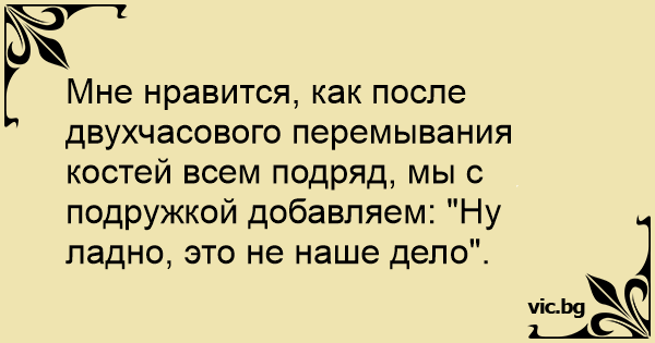 Мне нравится, как после двухчасового перемывания костей всем подряд, мы с подружкой добавляем: "Ну ладно, это не наше дело".