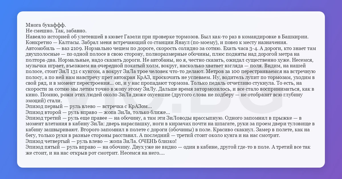 Многа букаффф. Не смешно. Так, забавно. Навеяло историей об улетевшей в кювет Газели при проверке тормозов. Был как-то раз в командировке в Башкирии. Конкретно — Калтасы. Забрал меня встречающий со станции Янаул (по-моему), и повез к месту назначения. Автомобиль — ваз 2109. Нормально чешем по дороге, скорость солидно за сотню. Ехать часа 3-4. А дороги, кто знает там двухполосные — по одной полосе в свою сторону, полноразмерные обочины, плюс подняты над дорогой метра на полтора-два. Нормальные, надо сказать дороги. Не автобаны, но я, честно сказать, ожидал существенно хуже. Несемся, музычка играет, въезжаем на очередной покатый холм, вокруг, насколько хватает взгляда — поля. Видим, на нашей полосе, стоит ЗиЛ 131 с кунгом, а вокруг ЗиЛа трое человек что-то делают. Метров за 100 перестраиваемся на встречную полосу, а по ней нам навстречу прет автокран КрАЗ, проскочить не успеваем. Ну, водитель лупит по тормозам, уходим в свой ряд, и в момент перестроения... оп, и у нас пропадают тормоза. Только педаль отчетливо стукнула. То есть, на скорости за сотню мы летим точно в жопу этому ЗиЛу. Дальше время затормозилось, и все стало восприниматься, как в кино. Помню, рожи этих людей около ЗиЛа дюже охуевшие (другого слова не подберу — не отобразит всю глубину эмоций) стали. Эпизод первый — руль влево — встречка с КрАЗом... Эпизод второй — руль вправо — жoпa ЗиЛа, только ближе... Эпизод третий — руль еще правее — на обочину, а там эти ЗиЛоводы врассыпную. Одного запомнил в прыжке — в момент влетания в кабину ЗиЛа: дверь нараспашку, ноги в кирзачах почти на шпагате, руки за проем двери туловище в кабину зашвыривают. Второго запомнил в полете с дороги (обочины) в поле. Красиво скакнул. Замер в полете, как на бегу, только руки в разные стороны расставил. А последний — третий стоит около кунга и на нас смотрит. Эпизод четвертый — руль влево — жoпa ЗиЛа. ОЧЕНЬ близко! Эпизод пятый — руль вправо — на обочину. Двух уже не видно — один в кабине, другой где-то в поле. А третий все так же стоит, и на нас открыв рот смотрит. Несемся на него. Эпизод шестой — доворачивает водитель руль до упора вправо, на обочине — спрессованый с землей гравий, нас тащит на третьего и медленно разворачивает вправо — в поле. И в последний момент, прямо перед нашим капотом этот третий отскакивает влево (от нас) и вжимается спиной в кунг. Потом пришло понимание, что он своим телом точно повторил все формы кунга, и колес заднего моста, а живот втянул так, что, наверное, желудок в позвоночник уперся. Пролетели мы от него в каком-то миллиметре. Только зеркало по спецовке чиркнуло, и тут нас выкинуло вправо. На этой многострадальной девятке слетаем мы нахрен, с дороги где-то с двухметровой высоты. Отчетливо приближается земля, честно говоря, ждал, что земля вздыбится и взметнется волной, как в кино показывают, но ничего этого не было, мы в нее достаточно мягко плюхаемся мордой,а потом приземляемся днищем. Все. Встали. Время припустило вскачь. Замечаю, что я сижу спокойный, с нормальной физиономией. Урчит двигатель. Открываем двери, вылезаем. Смотрим друг на друга, вроде все живы-целы. И тут меня накрывает. Колени ослабли, спина стала какая-то уставшая, как будто мешки всю ночь ворочал, замутило как-то... ЗиЛоводы уже собрались у своего автомобиля, сами перепуганы, завели свое чудовище, метров через двадцать, съехали на поле, 