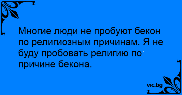 Многие люди не пробуют бекон по религиозным причинам. Я не буду пробовать религию по причине бекона.