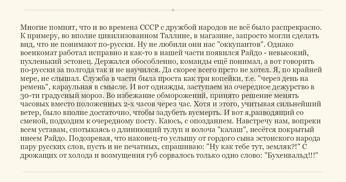 Многие помнят, что и во времена СССР с дружбой народов не всё было распрекрасно. К примеру, во вполне цивилизованном Таллине, в магазине, запросто могли сделать вид, что не понимают по-русски. Ну не любили они нас "оккупантов". Однако военкомат работал исправно и как-то в нашей части появился Райдо - невысокий, пухленький эстонец. Держался обособленно, команды ещё понимал, а вот говорить по-русски за полгода так и не научился. Да скорее всего прсто не хотел. Я, по крайней мере, не слышал. Служба в части была проста как три копейки, т.е. "через день на ремень", караульная в смысле. И вот однажды, заступаем на очередное дежурство в 30-ти градусный мороз. Во избежание обморожений, принято решение менять часовых вместо положенных 2-х часов через час. Хотя и этого, учитывая сильнейший ветер, было вполне достаточно, чтобы задубеть вусмерть. И вот я,разводящий со сменой, подходим к очередному посту. Каюсь, с опозданием. Навстречу нам, вопреки всем уставам, спотыкаясь о длиннющий тулуп и волоча "калаш", несётся покрытый инеем Райдо. Подозревая, что наконец-то услышу от гордого сына эстонского народа пару русских слов, пусть и не печатных, спрашиваю: "Ну как тебе тут, земляк?!" С дрожащих от холода и возмущения губ сорвалось только одно слово: "Бухенвальд!!!"