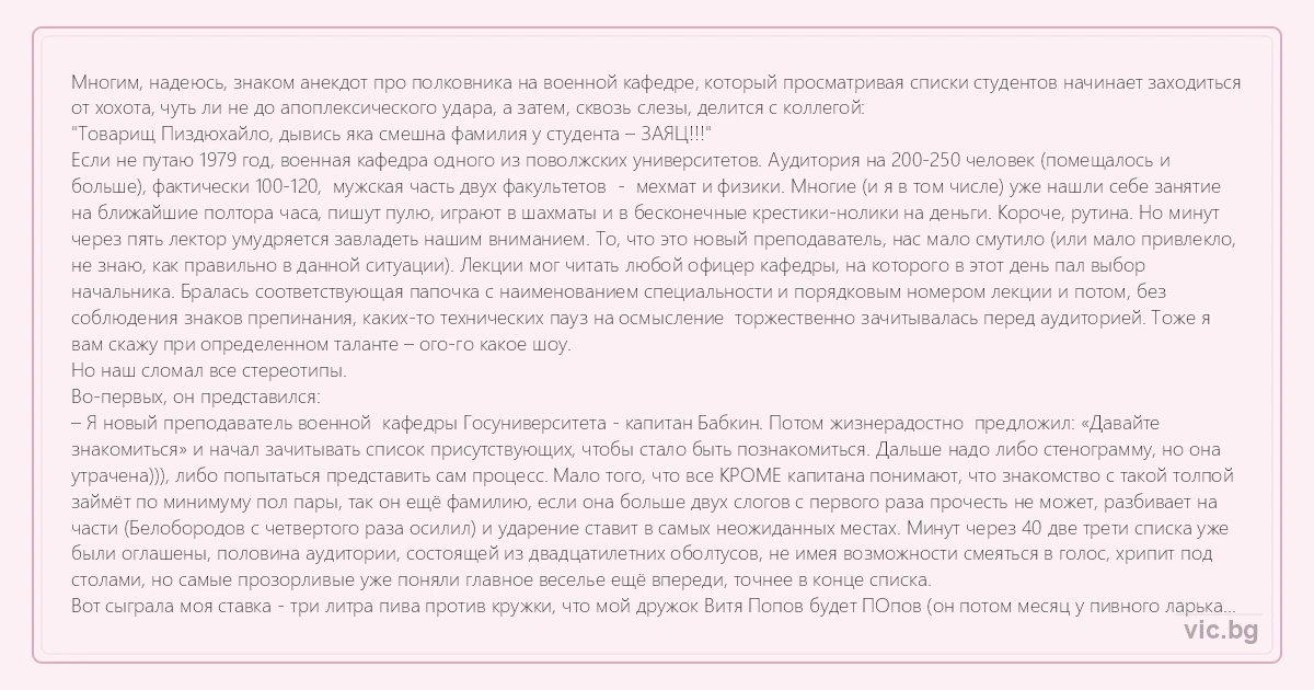 – Я новый преподаватель военной кафедры Госуниверситета - капитан Бабкин. Потом жизнерадостно предложил: «Давайте знакомиться» и начал зачитывать список присутствующих, чтобы стало быть познакомиться. Дальше надо либо стенограмму, но она утрачена))), либо попытаться представить сам процесс. Мало того, что все КРОМЕ капитана понимают, что знакомство с такой толпой займёт по минимуму пол пары, так он ещё фамилию, если она больше двух слогов с первого раза прочесть не может, разбивает на части (Белобородов с четвертого раза осилил) и ударение ставит в самых неожиданных местах. Минут через 40 две трети списка уже были оглашены, половина аудитории, состоящей из двадцатилетних оболтусов, не имея возможности смеяться в голос, хрипит под столами, но самые прозорливые уже поняли главное веселье ещё впереди, точнее в конце списка.