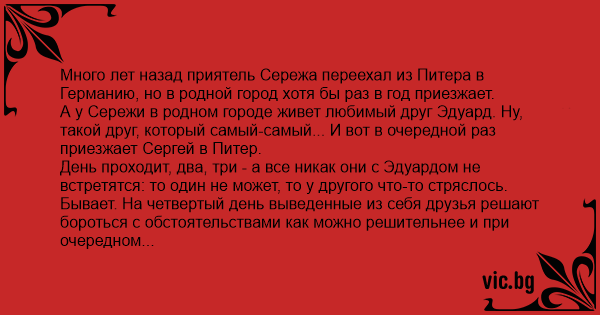 А у Сережи в родном городе живет любимый друг Эдуард. Ну, такой друг, который самый-самый... И вот в очередной раз приезжает Сергей в Питер.