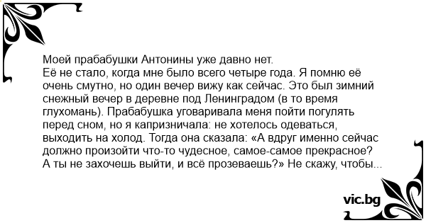 Её не стало, когда мне было всего четыре года. Я помню её очень смутно, но один вечер вижу как сейчас. Это был зимний снежный вечер в деревне под Ленинградом (в то время глухомань). Прабабушка уговаривала меня пойти погулять перед сном, но я капризничала: не хотелось одеваться, выходить на холод. Тогда она сказала: «А вдруг именно сейчас должно произойти что-то чудесное, самое-самое прекрасное? А ты не захочешь выйти, и всё прозеваешь?» Не скажу, чтобы я слишком поверила, но оделась и вышла с ней на улицу.