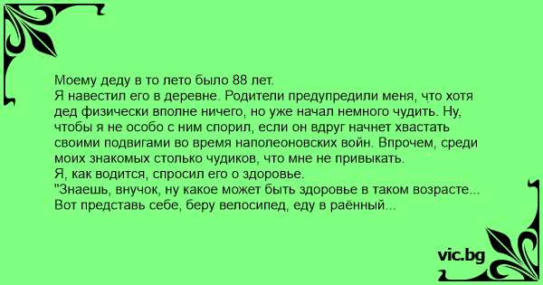 "Знаешь, внучок, ну какое может быть здоровье в таком возрасте... Вот представь себе, беру велосипед, еду в раённый центр, приезжаю и не могу вспомнить, а что мне здесь надо было. Сажусь на велосипед и еду домой. Так что про здоровье лучше не спрашивай."