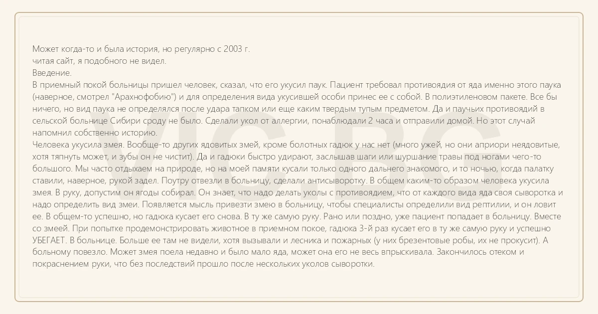 Может когда-то и была история, но регулярно с 2003 г. читая сайт, я подобного не видел. Введение. В приемный покой больницы пришел человек, сказал, что его укусил паук. Пациент требовал противоядия от яда именно этого паука (наверное, смотрел "Арахнофобию") и для определения вида укусившей особи принес ее с собой. В полиэтиленовом пакете. Все бы ничего, но вид паука не определялся после удара тапком или еще каким твердым тупым предметом. Да и паучьих противоядий в сельской больнице Сибири сроду не было. Сделали укол от аллергии, понаблюдали 2 часа и отправили домой. Но этот случай напомнил собственно историю. Человека укусила змея. Вообще-то других ядовитых змей, кроме болотных гадюк у нас нет (много ужей, но они априори неядовитые, хотя тяпнуть может, и зубы он не чистит). Да и гадюки быстро удирают, заслышав шаги или шуршание травы под ногами чего-то большого. Мы часто отдыхаем на природе, но на моей памяти кусали только одного дальнего знакомого, и то ночью, когда палатку ставили, наверное, рукой задел. Поутру отвезли в больницу, сделали антисыворотку. В общем каким-то образом человека укусила змея. В руку, допустим он ягоды собирал. Он знает, что надо делать уколы с противоядием, что от каждого вида яда своя сыворотка и надо определить вид змеи. Появляется мысль привезти змею в больницу, чтобы специалисты определили вид рептилии, и он ловит ее. В общем-то успешно, но гадюка кусает его снова. В ту же самую руку. Рано или поздно, уже пациент попадает в больницу. Вместе со змеей. При попытке продемонстрировать животное в приемном покое, гадюка 3-й раз кусает его в ту же самую руку и успешно УБЕГАЕТ. В больнице. Больше ее там не видели, хотя вызывали и лесника и пожарных (у них брезентовые робы, их не прокусит). А больному повезло. Может змея поела недавно и было мало яда, может она его не весь впрыскивала. Закончилось отеком и покраснением руки, что без последствий прошло после нескольких уколов сыворотки.