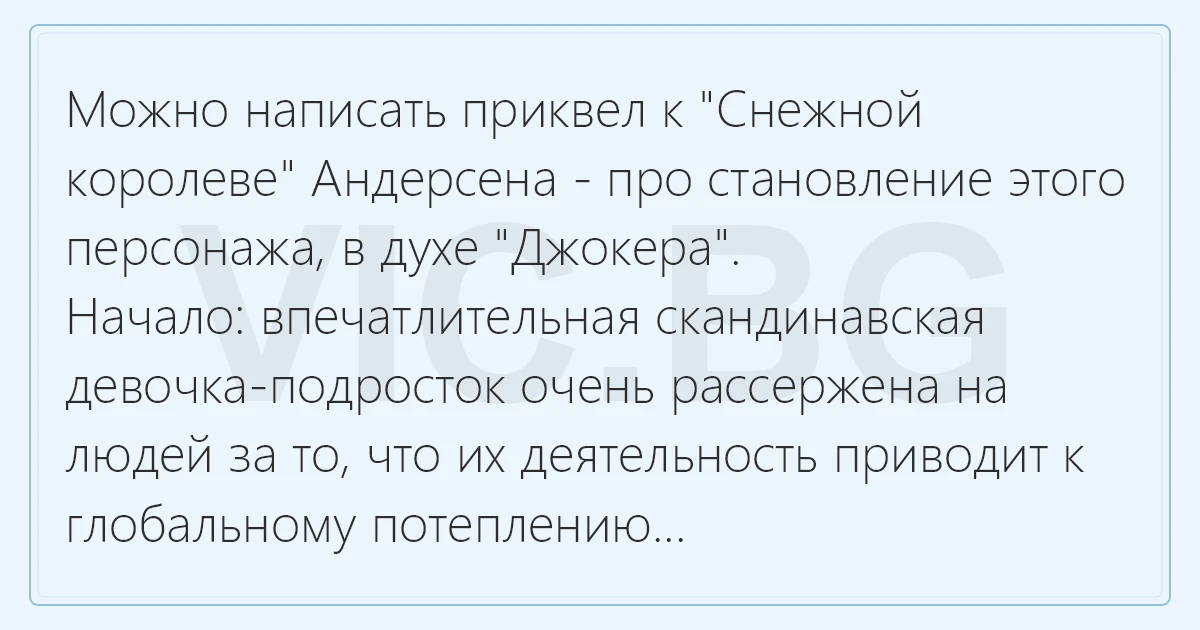 Можно написать приквел к "Снежной королеве" Андерсена - про становление этого персонажа, в духе "Джокера".