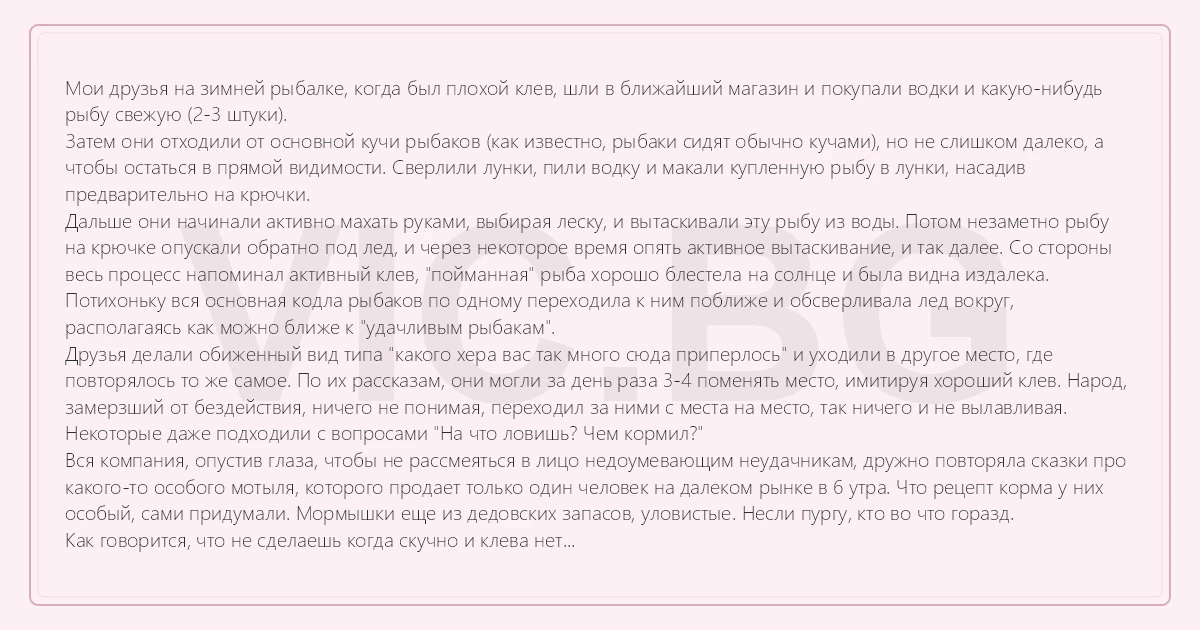 Друзья делали обиженный вид типа "какого хера вас так много сюда приперлось" и уходили в другое место, где повторялось то же самое. По их рассказам, они могли за день раза 3-4 поменять место, имитируя хороший клев. Народ, замерзший от бездействия, ничего не понимая, переходил за ними с места на место, так ничего и не вылавливая. Некоторые даже подходили с вопросами "На что ловишь? Чем кормил?"
