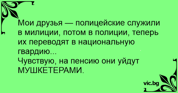 Мои друзья — полицейские служили в милиции, потом в полиции, теперь их переводят в национальную гвардию...<br />Чувствую, на пенсию они уйдут МУШКЕТЕРАМИ.