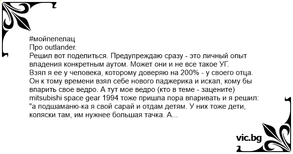 Взял я ее у человека, которому доверяю на 200% - у своего отца. Он к тому времени взял себе нового паджерика и искал, кому бы впарить свое ведро. А тут мое ведро (кто в теме - зацените) mitsubishi spaсе gear 1994 тоже пришла пора впаривать и я решил: "а подшаманю-ка я свой сарай и отдам детям. У них тоже дети, коляски там, им нужнее большая тачка. А себе возьму outlander intence 2009, 103 kW, 2.0 di-d, 7 мест." У бати, еще раз говорю. А кто знает батю, тот понимает, о чем я. У него дома мухи ходят в тапочках и все пылинки пронумерованы. И тачки обслуживаются строго по регламенту и у оф. предов. Он и аута этого взял двухлеткой через оф.салон у какого-то эстоноземельца из Пярну. Со всей историей, как положено. Отъездил три года и впарил. Мне. За полцены. И честно предупредил, машина, мол, в обслуживании дороговата. И я, чей опыт владения тачками опирался на 20-летние жигули, кадеты и экзотических японцев типа MX3 V6, решил: "а чо, старые машины ходят по 20 лет, новая 30 проходит!" Ага.