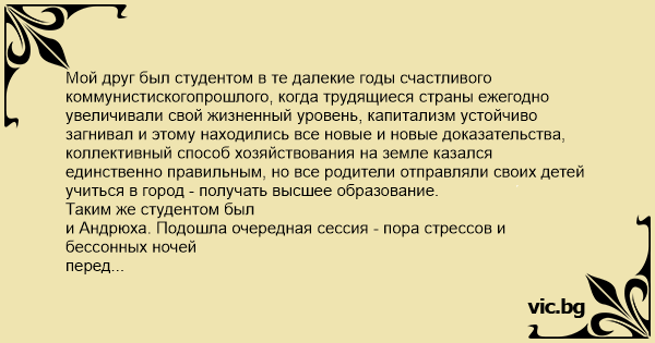 Мой друг был студентом в те далекие годы счастливого коммунистискогопрошлого, когда трудящиеся страны ежегодно увеличивали свой жизненный уровень, капитализм устойчиво загнивал и этому находились все новые и новые доказательства, коллективный способ хозяйствования на земле казался единственно правильным, но все родители отправляли своих детей учиться в город - получать высшее образование.