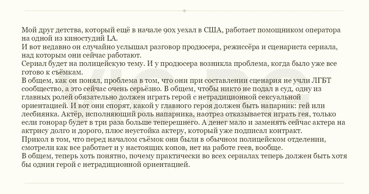 В общем, как он понял, проблема в том, что они при составлении сценария не учли ЛГБТ сообщество, а это сейчас очень серьёзно. В общем, чтобы никто не подал в суд, одну из главных ролей обязательно должен играть герой с нетрадиционной сексуальной ориентацией. И вот они спорят, какой у главного героя должен быть напарник: гeй или лесбиянка. Актёр, исполняющий роль напарника, наотрез отказывается играть гея, только если гонорар будет в три раза больше теперешнего. А денег мало и заменять сейчас актера на актрису долго и дорого, плюс неустойка актеру, который уже подписал контракт.