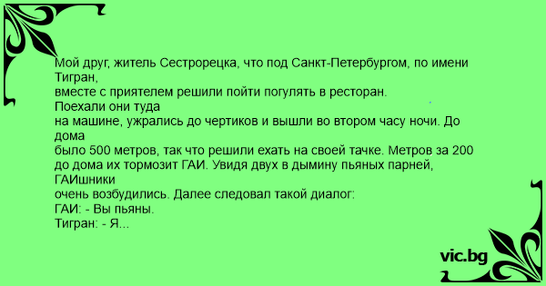 Мой друг, житель Сестрорецка, что под Санкт-Петербургом, по имени Тигран, вместе с приятелем решили пойти погулять в ресторан.