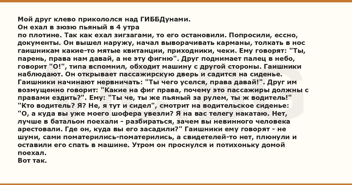 правами ездить?". Ему: "Ты че, ты же пьяный за рулем, ты ж водитель!"