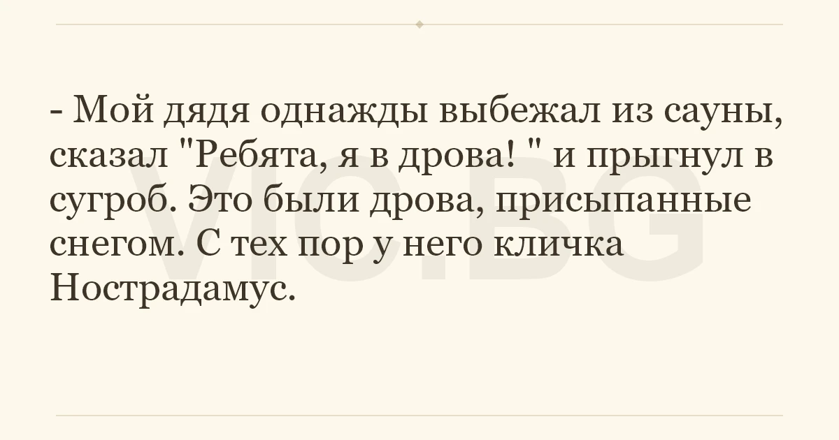 - Мой дядя однажды выбежал из сауны, сказал "Ребята, я в дрова! " и прыгнул в сугроб. Это были дрова, присыпанные снегом. С тех пор у него кличка Нострадамус.