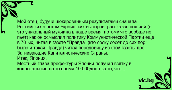 Мой отец, будучи шокированным результатами сначала Российских а потом Украинских выборов, рассказал под чай (а это уникальный мужчина в наше время, потому что вообще не пьет) как он осмыслил политику Коммунистической Партии еще в 70-ых, читая в газете "Правда" (кто соску сосет до сих пор: была и такая Правда) читая передовицу из этой газеты про Загнивающие Капиталистические Страны.