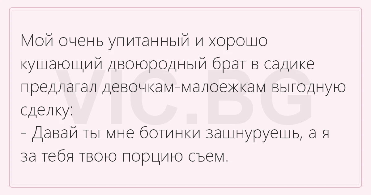 Мой очень упитанный и хорошо кушающий двоюродный брат в садике предлагал девочкам-малоежкам выгодную сделку: - Давай ты мне ботинки зашнуруешь, а я за тебя твою порцию съем.