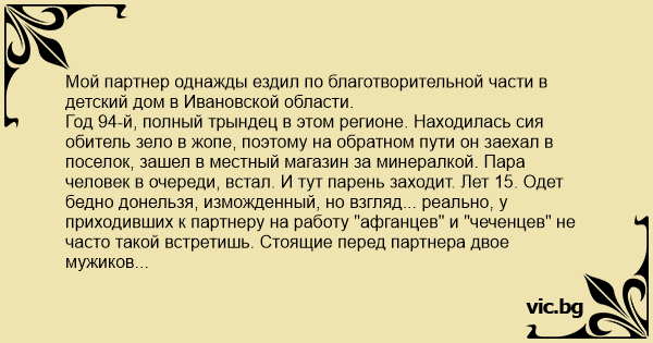 Год 94-й, полный трындец в этом регионе. Находилась сия обитель зело в жопе, поэтому на обратном пути он заехал в поселок, зашел в местный магазин за минералкой. Пара человек в очереди, встал. И тут парень заходит. Лет 15. Одет бедно донельзя, изможденный, но взгляд... реально, у приходивших к партнеру на работу "афганцев" и "чеченцев" не часто такой встретишь. Стоящие перед партнера двое мужиков отходят, предлагая пацану пройти к кассе. Продавщица спрашивает: "Иван Сергеевич, чего вам?"