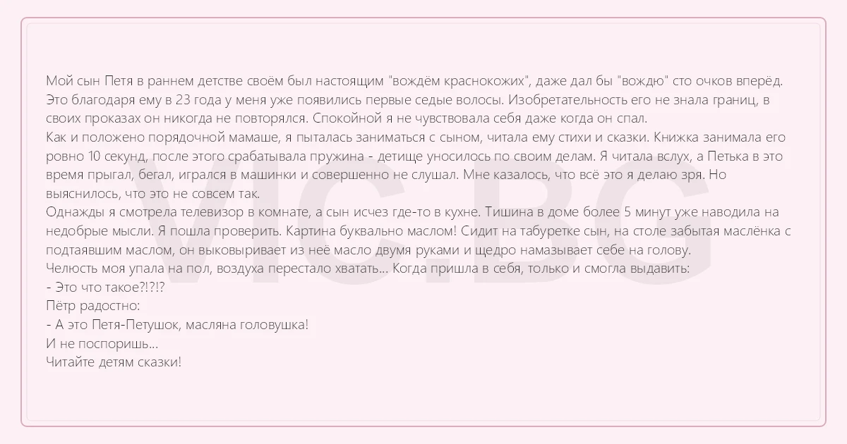 Мой сын Петя в раннем детстве своём был настоящим "вождём краснокожих", даже дал бы "вождю" сто очков вперёд. Это благодаря ему в 23 года у меня уже появились первые седые волосы. Изобретательность его не знала границ, в своих проказах он никогда не повторялся. Спокойной я не чувствовала себя даже когда он спал. Как и положено порядочной мамаше, я пыталась заниматься с сыном, читала ему стихи и сказки. Книжка занимала его ровно 10 секунд, после этого срабатывала пружина - детище уносилось по своим делам. Я читала вслух, а Петька в это время прыгал, бегал, игрался в машинки и совершенно не слушал. Мне казалось, что всё это я делаю зря. Но выяснилось, что это не совсем так. Однажды я смотрела телевизор в комнате, а сын исчез где-то в кухне. Тишина в доме более 5 минут уже наводила на недобрые мысли. Я пошла проверить. Картина буквально маслом! Сидит на табуретке сын, на столе забытая маслёнка с подтаявшим маслом, он выковыривает из неё масло двумя руками и щедро намазывает себе на голову. Челюсть моя упала на пол, воздуха перестало хватать... Когда пришла в себя, только и смогла выдавить: - Это что такое?!?!? Пётр радостно: - А это Петя-Петушок, масляна головушка! И не поспоришь... Читайте детям сказки!