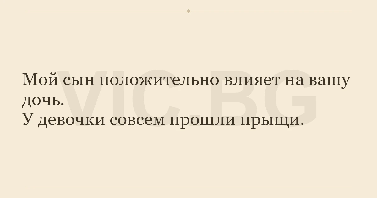 Мой сын положительно влияет на вашу дочь. У девочки совсем прошли прыщи.