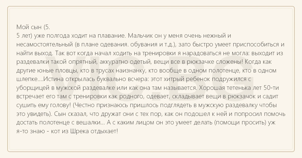 5 лет) уже полгода ходит на плавание. Мальчик он у меня очень нежный и несамостоятельный (в плане одевания. обувания и т.д.), зато быстро умеет приспособиться и найти выход. Так вот когда начал ходить на тренировки я нарадоваться не могла: выходит из раздевалки такой опрятный, аккуратно одетый, вещи все в рюкзачке сложены! Когда как другие юные пловцы, кто в трусах наизнанку, кто вообще в одном полотенце, кто в одном шлепке....Истина открылась буквально всчера: этот хитрый ребенок подружился с уборщицей в мужской раздевалке или как она там называется. Хорошая тетенька лет 50-ти встречает его там с тренировки как родного, одевает, складывает вещи в рюкзачок и садит сушить ему голову! (Честно признаюсь пришлось подглядеть в мужскую раздевалку чтобы это увидеть). Сын сказал, что дружат они с тех пор, как он подошел к ней и попросил помочь достать полотенце с вешалки... А с каким лицом он это умеет делать (помощи просить) уж я-то знаю - кот из Шрека отдыхает!