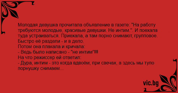 Молодая девушка прочитала объявление в газете: "На работу требуются молодые, красивые девушки. Не интим.". И поехала туда устраиваться. Приехала, а там поpно снимают, групповое.