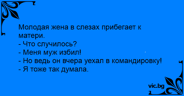 Proaspăt căsătorită, o fată se plânge mamei că soţul i-a făcut o vânătaie sub ochi. - Sunt surprinsă! Eu îl credeam plecat în delegaţie, spune mama. - Şi eu!