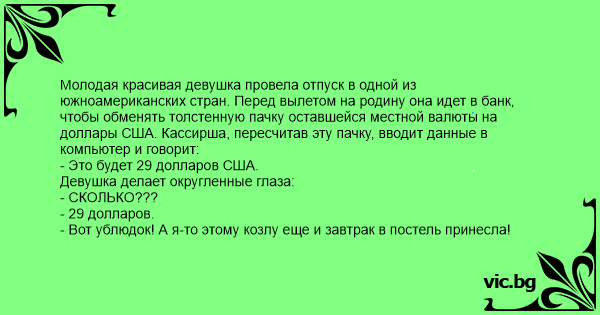 Молодая красивая девушка провела отпуск в одной из южноамериканских стран. Перед вылетом на родину она идет в банк, чтобы обменять толстенную пачку оставшейся местной валюты на доллары США. Кассирша, пересчитав эту пачку, вводит данные в компьютер и говорит: