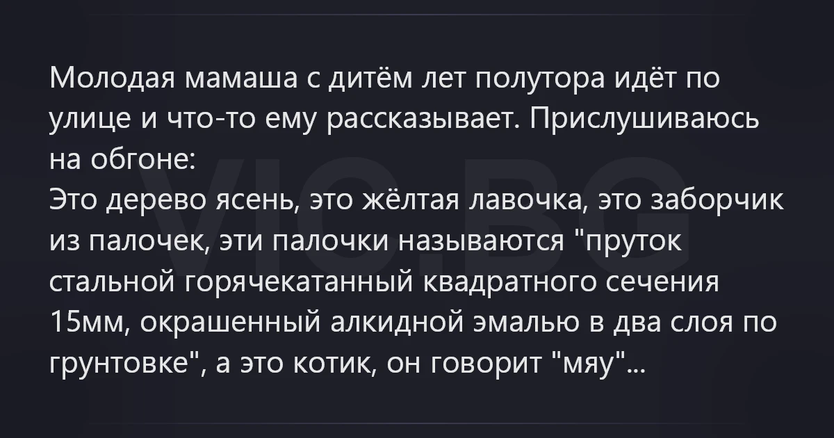 Молодая мамаша с дитём лет полутора идёт по улице и что-то ему рассказывает. Прислушиваюсь на обгоне: Это дерево ясень, это жёлтая лавочка, это заборчик из палочек, эти палочки называются "пруток стальной горячекатанный квадратного сечения 15мм, окрашенный алкидной эмалью в два слоя по грунтовке", а это котик, он говорит "мяу"...