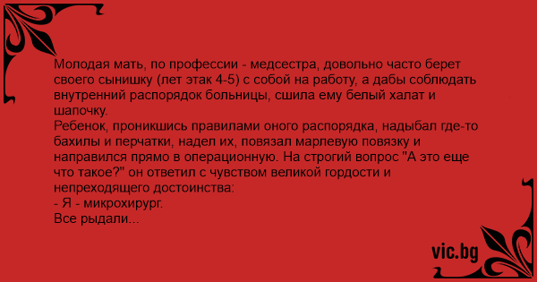 Молодая мать, по профессии - медсестра, довольно часто берет своего сынишку (лет этак 4-5) с собой на работу, а дабы соблюдать внутренний распорядок больницы, сшила ему белый халат и шапочку.