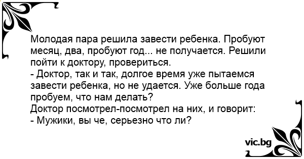 - Доктор, так и так, долгое время уже пытаемся завести ребенка, но не удается. Уже больше года пробуем, что нам делать?