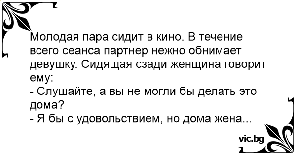 Молодая пара сидит в кино. В течение всего сеанса партнер нежно обнимает девушку. Сидящая сзади женщина говорит ему: