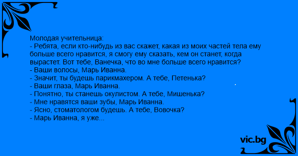 - Pебята, если кто-нибудь из вас скажет, какая из моих частей тела ему больше всего нравится, я смогу ему сказать, кем он станет, когда вырастет. Вот тебе, Ванечка, что во мне больше всего нравится?