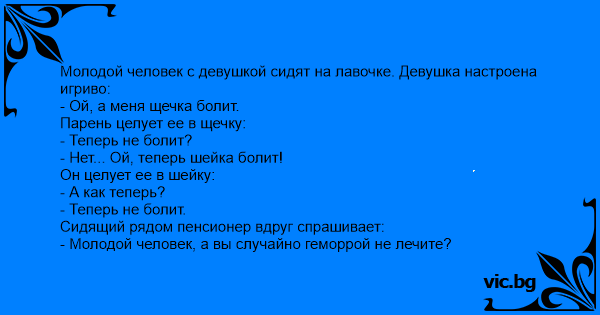Една вечер в парка двама младежи си седят и си говорят. До тях на съседната пейка седи сляп старец. Момчето е много притеснително, а момичето през цялото време се чуди как да го накара да я целуне: - Ох, ръката ме заболя - възкликва в тишината то. Момчето веднага и взима ръката и я целува. -...