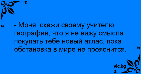 - Моня, скажи своему учителю географии, что я не вижу смысла покупать тебе новый атлас, пока обстановка в мире не прояснится.