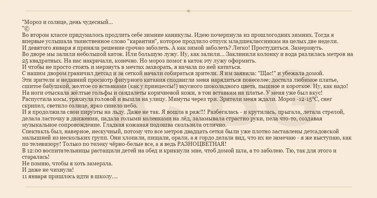 "Мороз и солнце, день чудесный... "© Во втором классе придумалось продлить себе зимние каникулы. Идею почерпнула из прошлогодних зимних. Тогда я впервые услышала таинственное слово "карантин", которое продлило отпуск младшеклассникам на целых две недели. И девятого января я приняла решение срочно заболеть. А как зимой заболеть? Легко! Простудиться. Замерзнуть. Во дворе мы залили небольшой каток. Или большую лужу. Ну, как залили... Заклинили колонку и вода разлилась метров на 25 квадратных. На нас накричали, конечно. Но мороз помог в каток эту лужу оформить. И чтобы не просто стоять и мерзнуть в мечтах захворать, я начала по ней кататься. С нашим двором граничил детсад и за сеткой начали собираться зрители. Я им заявила: "Щас!" и убежала домой. Эти зрители и недавний просмотр фигурного катания сподвигли меня нарядиться повеселее: достала любимое платье, сшитое бабушкой, желтое со вставками (как у принцессы!) вкусного шоколадного цвета, пышное и короткое. Ну, как надо! На ноги отыскала жёлтые гольфы и сандалеты коричневой кожи, в тон вставкам на платье. У меня уже был вкус! Распустила косы, тряхнула головой и вышла на улицу. Минуты через три. Зрители меня ждали. Мороз -12-15°С, снег скрипел, светило солнце, ярко синело небо. И я продолжила свои пируэты на льду. Даже не так. Я вошла в раж!!! Разбегалась - и крутилась, прыгала, летала стрелой, делала ласточку в движении, падала голыми коленками на лёд, заламывала страстно руки, пела что-то, создавая музыкальное сопровождение. Гладкая кожаная подошва скользила отлично. Спектакль был, наверное, нескучный, потому что все метров двадцать сетки были уже плотно заставлены детсадовской малышней из нескольких групп. Они хлопали, пищали, орали, а я гордо делала вид, что их не замечаю - я же выступаю, как по телевизору! Только по телеку чёрно-белые все, а я ведь РАЗНОЦВЕТНАЯ! В 12:00 воспитательницы растащили детей на обед и крикнули мне, чтоб домой шла, а то заболею. Тю, так для этого и старалась! Не помню, чтобы я хоть замерзла. И даже не чихнула! 11 января пришлось идти в школу. Р.S. Потом воспитательницы жаловались маме, потому что им жаловались родители. Некоторые девочки с истерикой потребовали нарядить их в платья и гольфы и так топать в детсад. Потому что они видели, что и зимой "так можно".