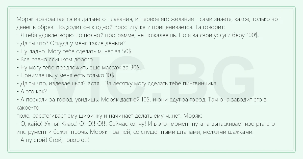 Моряк возвращается из дальнего плавания, и первое его желание - сами знаете, какое, только вот денег в обрез. Подходит он к одной npоcтитyтке и приценивается. Та говорит:
