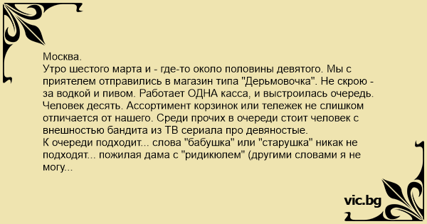 Москва. Утро шестого марта и - где-то около половины девятого. Мы с приятелем отправились в магазин типа "Дерьмовочка". Не скрою - за водкой и пивом. Работает ОДНА касса, и выстроилась очередь. Человек десять. Ассортимент корзинок или тележек не слишком отличается от нашего. Среди прочих в очереди стоит человек с внешностью бандита из ТВ сериала про девяностые. К очереди подходит... слова "бабушка" или "старушка" никак не подходят... пожилая дама с "ридикюлем" (другими словами я не могу описать её сумочку) и просит её пропустить, потому что ей надо быстро вернуться домой. Конечно, её пропускают - что бы про нас не говорили, но мы - москвичи - тоже люди. Следующий акт пьесы: Из "ридикюля" пожилая дама достает перед кассиршей две бутылки водки, а затем демонстрирует содержимое тележки: дюжину пива. Для очереди озвучивает: "Ко мне фронтовой друг приехал, вот я и вышла в магазин, пока он не проснулся"... Секудная оторопь, и шквал оваций. А человек со внешностью бандита всё-таки выиграл необъявленный конкурс - забрал у пожилой дамы тяжелые сумки, посадил в свою машину, и всем пообещал, что доставит её до дома в целости и сохранности. И у кого-то ещё остались вопросы на тему "Почему русские выиграли войну?.."