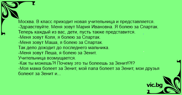 -Здравствуйте. Меня зовут Мария Ивановна. Я болею за Спартак. Теперь каждый из вас, дети, пусть также представится.