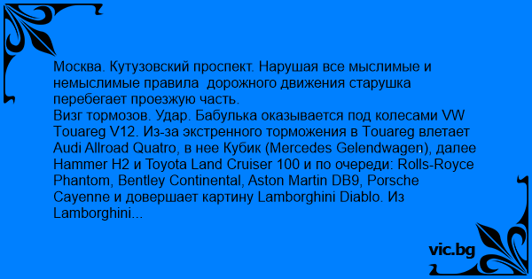 Визг тормозов. Удар. Бабулька оказывается под колесами VW Тouareg V12. Из-зa экстренного торможения в Тouareg влетает Audi Allroad Quatro, в нее Кубик (Меrсеdеs Gеlеndwagen), далее Hammer H2 и Toyota Land Cruiser 100 и по очереди: Rolls-Royce Phantom, Bentley Continental, Aston Martin DB9, Porsche Cayenne и довершает картину Lamborghini Diablo. Из Lamborghini выходит водитель, отходит назад и в сторону, чтобы лучше обозреть всю эту картину, и произносит с нотками восхищения в голосе: