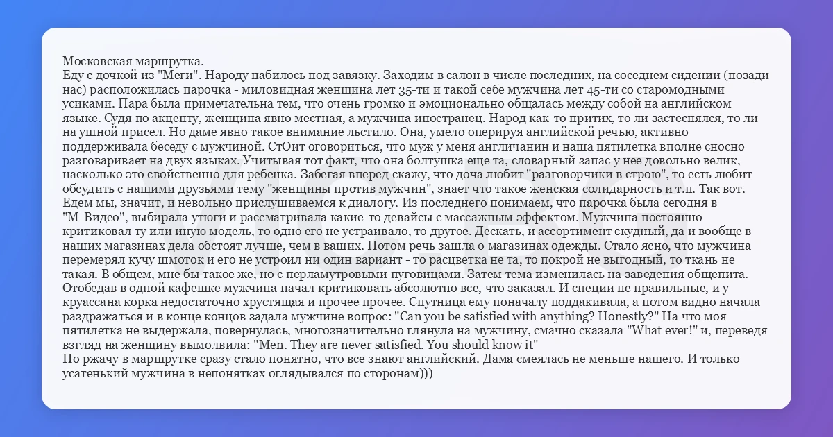 Московская маршрутка. Еду с дочкой из "Меги". Народу набилось под завязку. Заходим в салон в числе последних, на соседнем сидении (позади нас) расположилась парочка - миловидная женщина лет 35-ти и такой себе мужчина лет 45-ти со старомодными усиками. Пара была примечательна тем, что очень громко и эмоционально общалась между собой на английском языке. Судя по акценту, женщина явно местная, а мужчина иностранец. Народ как-то притих, то ли застеснялся, то ли на ушной присел. Но даме явно такое внимание льстило. Она, умело оперируя английской речью, активно поддерживала беседу с мужчиной. СтОит оговориться, что муж у меня англичанин и наша пятилетка вполне сносно разговаривает на двух языках. Учитывая тот факт, что она болтушка еще та, словарный запас у нее довольно велик, насколько это свойственно для ребенка. Забегая вперед скажу, что доча любит "разговорчики в строю", то есть любит обсудить с нашими друзьями тему "женщины против мужчин", знает что такое женская солидарность и т.п. Так вот. Едем мы, значит, и невольно прислушиваемся к диалогу. Из последнего понимаем, что парочка была сегодня в "М-Видео", выбирала утюги и рассматривала какие-то девайсы с массажным эффектом. Мужчина постоянно критиковал ту или иную модель, то одно его не устраивало, то другое. Дескать, и ассортимент скудный, да и вообще в наших магазинах дела обстоят лучше, чем в ваших. Потом речь зашла о магазинах одежды. Стало ясно, что мужчина перемерял кучу шмоток и его не устроил ни один вариант - то расцветка не та, то покрой не выгодный, то ткань не такая. В общем, мне бы такое же, но с перламутровыми пуговицами. Затем тема изменилась на заведения общепита. Отобедав в одной кафешке мужчина начал критиковать абсолютно все, что заказал. И специи не правильные, и у круассана корка недостаточно хрустящая и прочее прочее. Спутница ему поначалу поддакивала, а потом видно начала раздражаться и в конце концов задала мужчине вопрос: "Can you be satisfied with anything? Honestly?" На что моя пятилетка не выдержала, повернулась, многозначительно глянула на мужчину, смачно сказала "What ever!" и, переведя взгляд на женщину вымолвила: "Men. They are never satisfied. You should know it" По ржачу в маршрутке сразу стало понятно, что все знают английский. Дама смеялась не меньше нашего. И только усатенький мужчина в непонятках оглядывался по сторонам)))