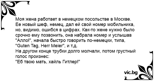 Ее новый шеф, немец, дал ей свой номер мобильника, но, видимо, ошибся в цифрах. Как-то жене нужно было срочно ему позвонить, она набрала номер и услышав "Алло!", начала быстро говорить по-немецки, типа, "Guten Tag, Herr Meier", и т.д.