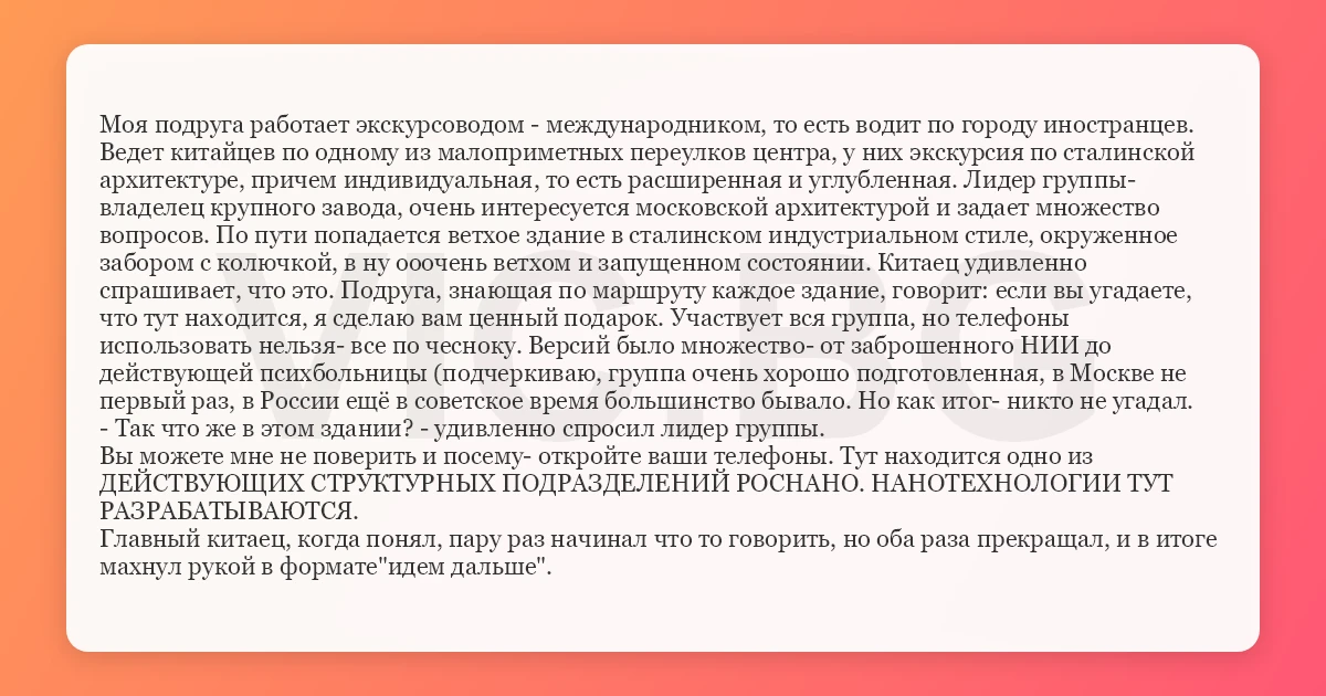 Моя подруга работает экскурсоводом - международником, то есть водит по городу иностранцев. Ведет китайцев по одному из малоприметных переулков центра, у них экскурсия по сталинской архитектуре, причем индивидуальная, то есть расширенная и углубленная. Лидер группы- владелец крупного завода, очень интересуется московской архитектурой и задает множество вопросов. По пути попадается ветхое здание в сталинском индустриальном стиле, окруженное забором с колючкой, в ну ооочень ветхом и запущенном состоянии. Китаец удивленно спрашивает, что это. Подруга, знающая по маршруту каждое здание, говорит: если вы угадаете, что тут находится, я сделаю вам ценный подарок. Участвует вся группа, но телефоны использовать нельзя- все по чесноку. Версий было множество- от заброшенного НИИ до действующей психбольницы (подчеркиваю, группа очень хорошо подготовленная, в Москве не первый раз, в России ещё в советское время большинство бывало. Но как итог- никто не угадал. - Так что же в этом здании? - удивленно спросил лидер группы. Вы можете мне не поверить и посему- откройте ваши телефоны. Тут находится одно из ДЕЙСТВУЮЩИХ СТРУКТУРНЫХ ПОДРАЗДЕЛЕНИЙ РОСНАНО. НАНОТЕХНОЛОГИИ ТУТ РАЗРАБАТЫВАЮТСЯ. Главный китаец, когда понял, пару раз начинал что то говорить, но оба раза прекращал, и в итоге махнул рукой в формате"идем дальше".