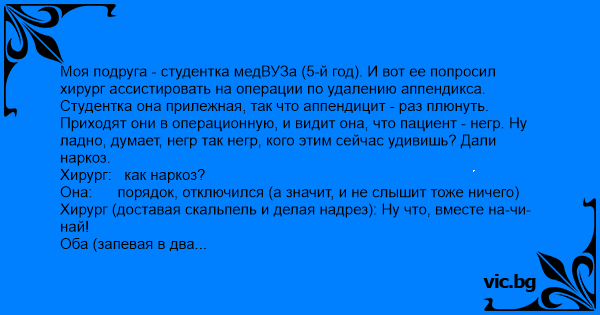 Моя подруга - студентка медВУЗа (5-й год). И вот ее попросил хирург ассистировать на операции по удалению аппендикса. Студентка она прилежная, так что аппендицит - раз плюнуть. Приходят они в операционную, и видит она, что пациент - нeгp. Ну ладно, думает, нeгp так нeгp, кого этим сейчас удивишь? Дали наркоз.