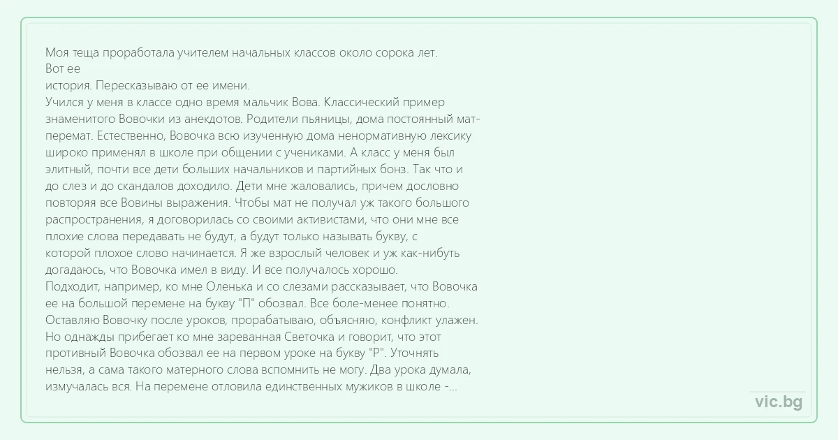 Моя теща проработала учителем начальных классов около сорока лет. Вот ее история. Пересказываю от ее имени. Учился у меня в классе одно время мальчик Вова. Классический пример знаменитого Вовочки из анекдотов. Родители пьяницы, дома постоянный мат- перемат. Естественно, Вовочка всю изученную дома ненормативную лексику широко применял в школе при общении с учениками. А класс у меня был элитный, почти все дети больших начальников и партийных бонз. Так что и до слез и до скандалов доходило. Дети мне жаловались, причем дословно повторяя все Вовины выражения. Чтобы мат не получал уж такого большого распространения, я договорилась со своими активистами, что они мне все плохие слова передавать не будут, а будут только называть букву, с которой плохое слово начинается. Я же взрослый человек и уж как-нибуть догадаюсь, что Вовочка имел в виду. И все получалось хорошо. Подходит, например, ко мне Оленька и со слезами рассказывает, что Вовочка ее на большой перемене на букву "П" обозвал. Все боле-менее понятно. Оставляю Вовочку после уроков, прорабатываю, объясняю, конфликт улажен. Но однажды прибегает ко мне зареванная Светочка и говорит, что этот противный Вовочка обозвал ее на первом уроке на букву "Р". Уточнять нельзя, а сама такого матерного слова вспомнить не могу. Два урока думала, измучалась вся. На перемене отловила единственных мужиков в школе - физика и физрука, их напрягла. Тоже ничего придумать не могут. Оставляю после уроков Вовочку и Свету. Начинаю осторожно разбираться, что же произошло. Света плачет, ничего не объясняет. А Вовочка, не чувствуя за собой особого греха, вдруг заявляет: - Тамара Ивановна, да ничего страшного не случилось, я у нее только карандаш попросил, а она не дала, жадина. Вот я и говорю, да в рот я тебя е... с твоим карандашом! Вот такой матерок на букву "Р".