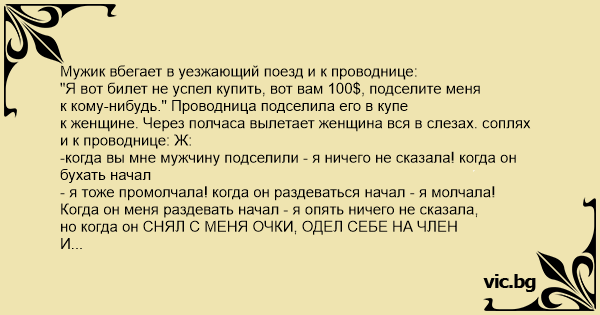 Мужик вбегает в уезжающий поезд и к проводнице: