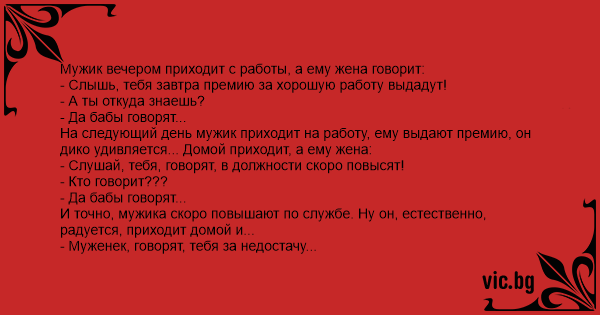 На следующий день мужик приходит на работу, ему выдают премию, он дико удивляется... Домой приходит, а ему жена: