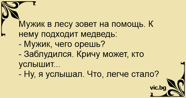 Мужик в лесу зовет на помощь. К нему подходит медведь: