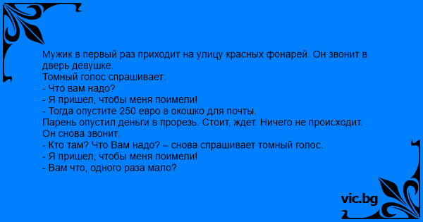 Мужик в первый раз приходит на улицу красных фонарей. Он звонит в дверь девушке.