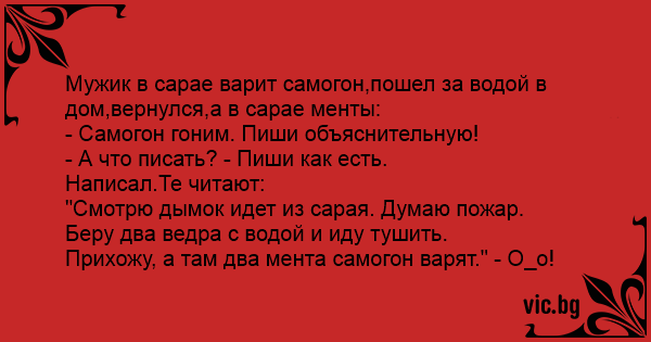 Мужик в сарае варит самогон,пошел за водой в дом,вернулся,а в сарае менты: